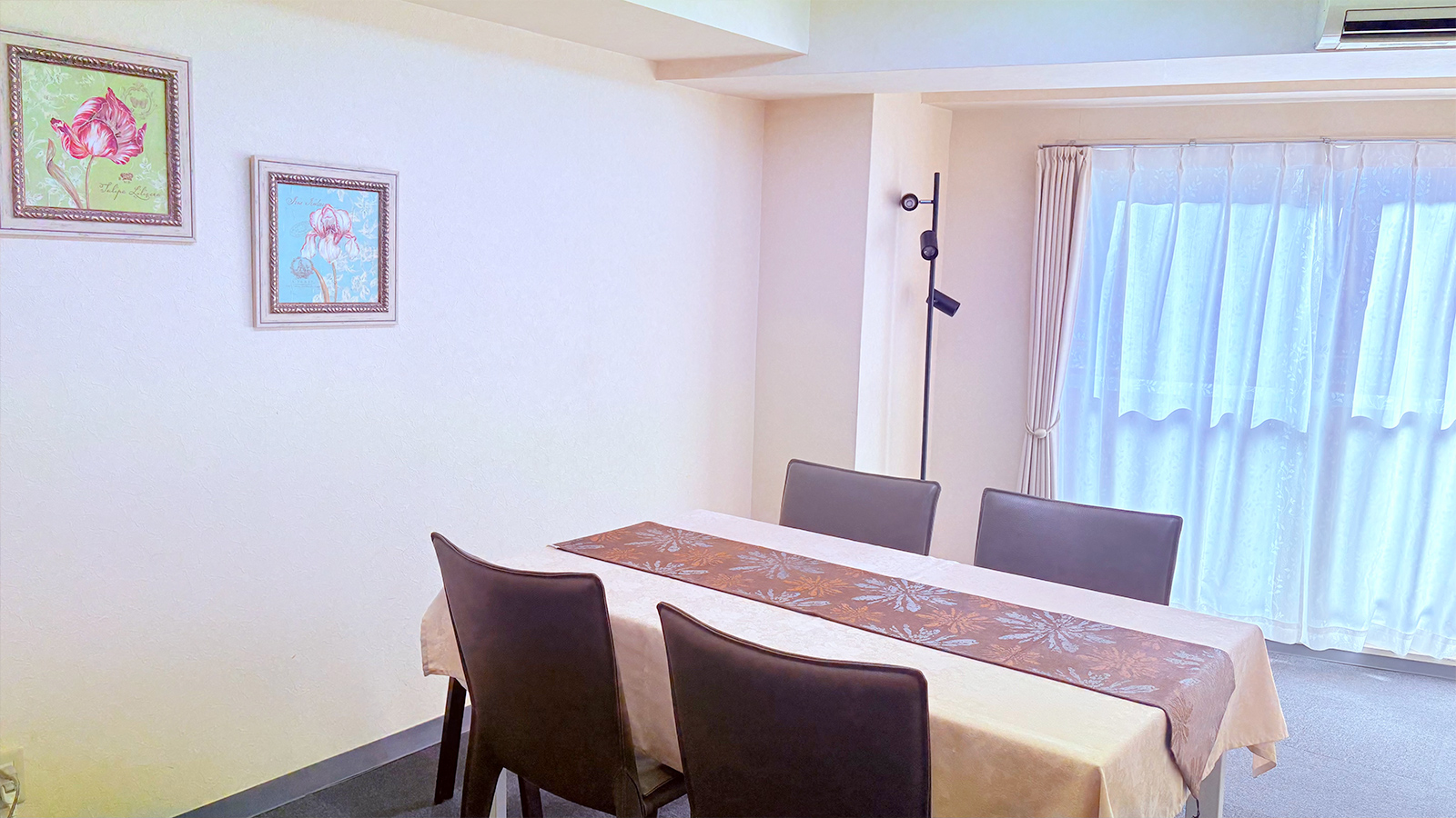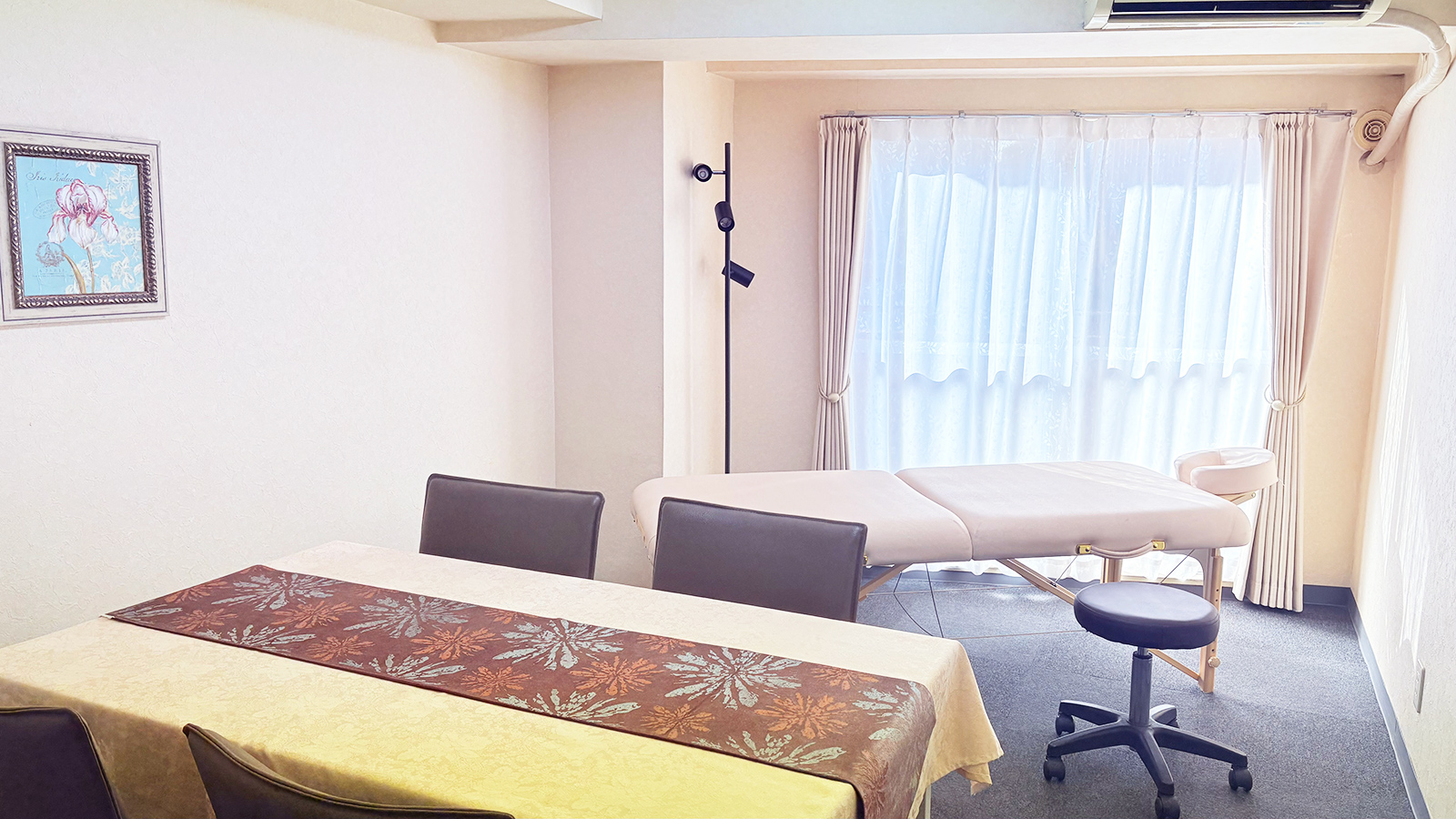 1004号室は、広いお部屋で日当たりも良く明るくてクライアント様の印象がとても良いです。4人がけのテーブルが用意されているので、施術の前後でカウンセリングする際にとても重宝しています。